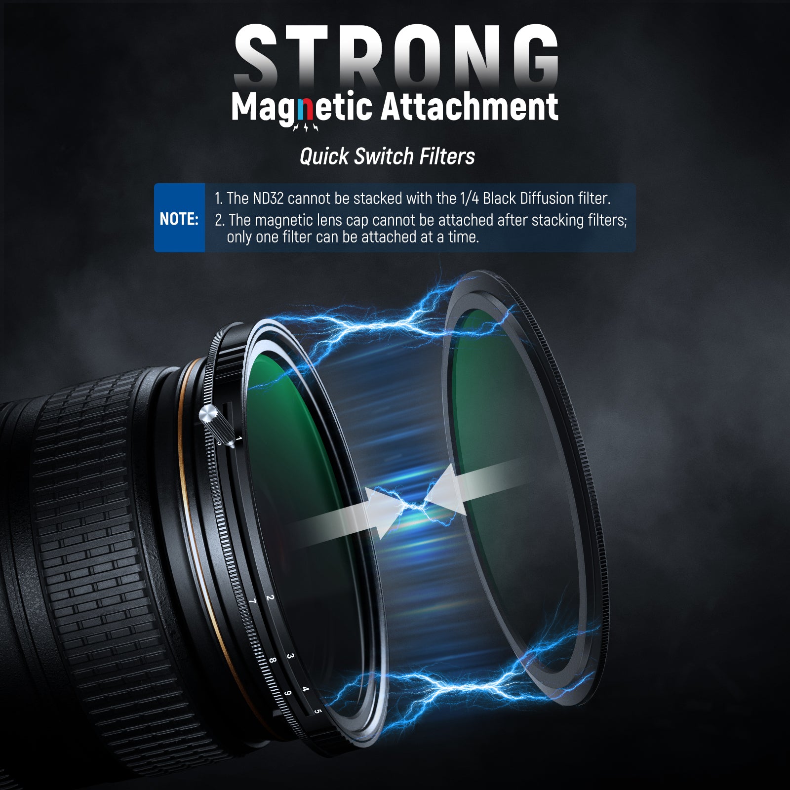 • Magnetic Stackable ND32 Filter- Includes an additional magnetic ND32 neutral density filter, effectively reducing light by 5 stops to address brighter sunlight conditions. This filter can be layered onto the 2 in 1 ND&CPL filter to provide extended light reduction choices, ranging from 6 to 9 stops. Please note that the ND32 cannot be used simultaneously with the Black Diffusion filter or the lens cap