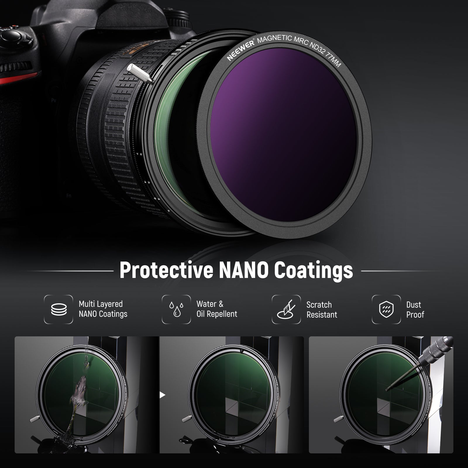 • Advanced NANO Coatings & Durable Frame- With 30 layers of multi functional NANO coatings on both sides of the HD optical glass, these filters are water repellent, scratch resistant, and oilproof. The aluminum alloy frame is lightweight and durable