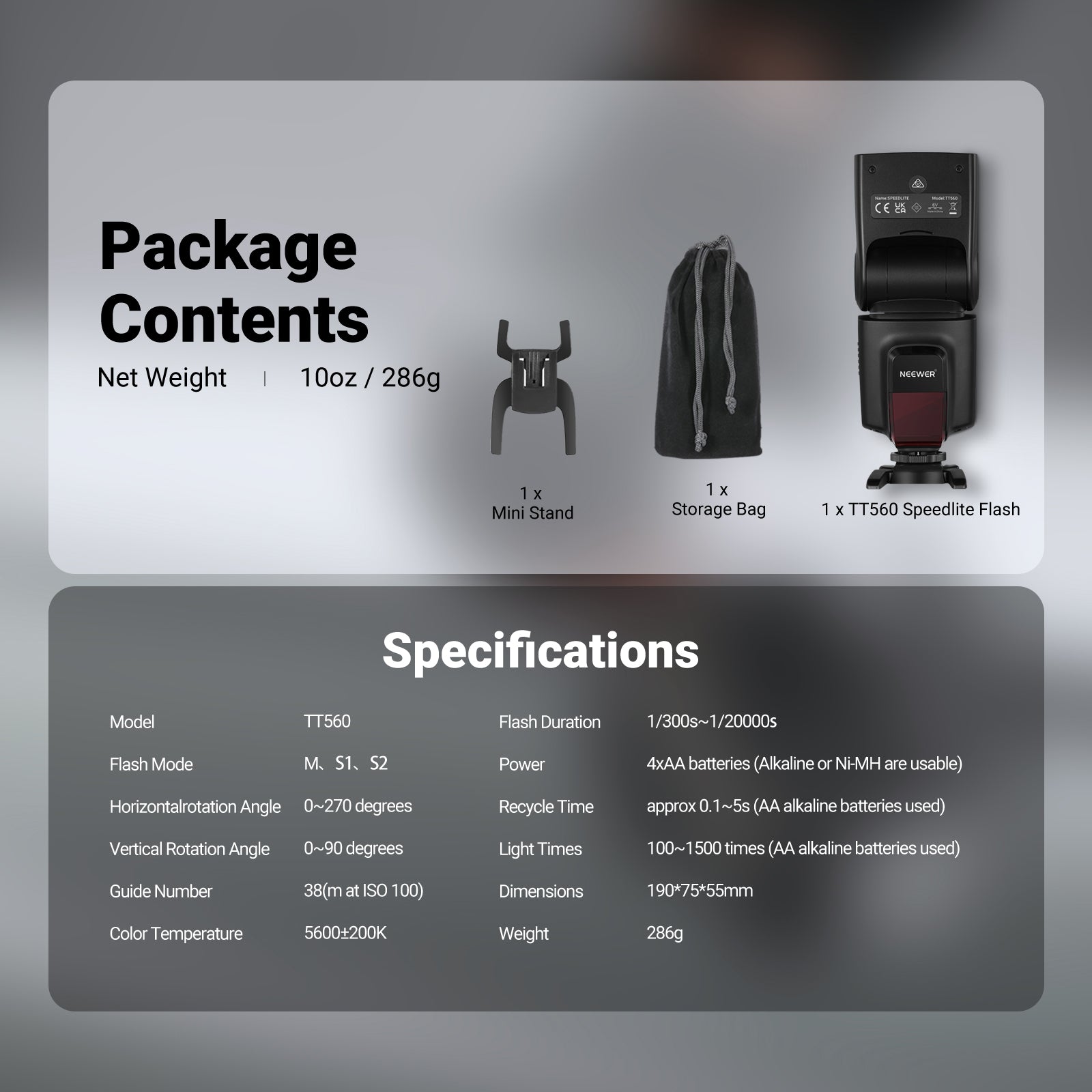 - Professional Flash Output for Stable Lighting- TT560 speed light features GN38 (ISO 100) guide number with 8 manual power levels from 1/128 to 1/1, stable 5600K±200K daylight color, 0.1–5s recycle time, and 1/300 to 1/20000s flash duration. Note: Does NOT support TTL, HSS, or camera menu control. Recommended shutter speed below 1/200s