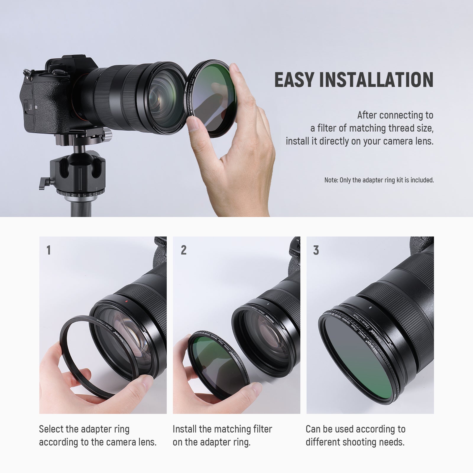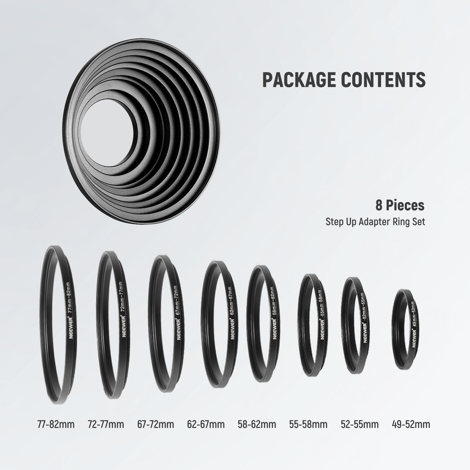 NEEWER offers step-up rings and step-down ring adapters, allowing lenses to be compatible with various filters and accessories of different sizes. These stepping rings are crafted from premium-grade aluminum with precision manufacturing to ensure smooth and secure mounting. They are extremely durable yet lightweight, featuring a polished, anodized matte surface for a sleek and professional finish.